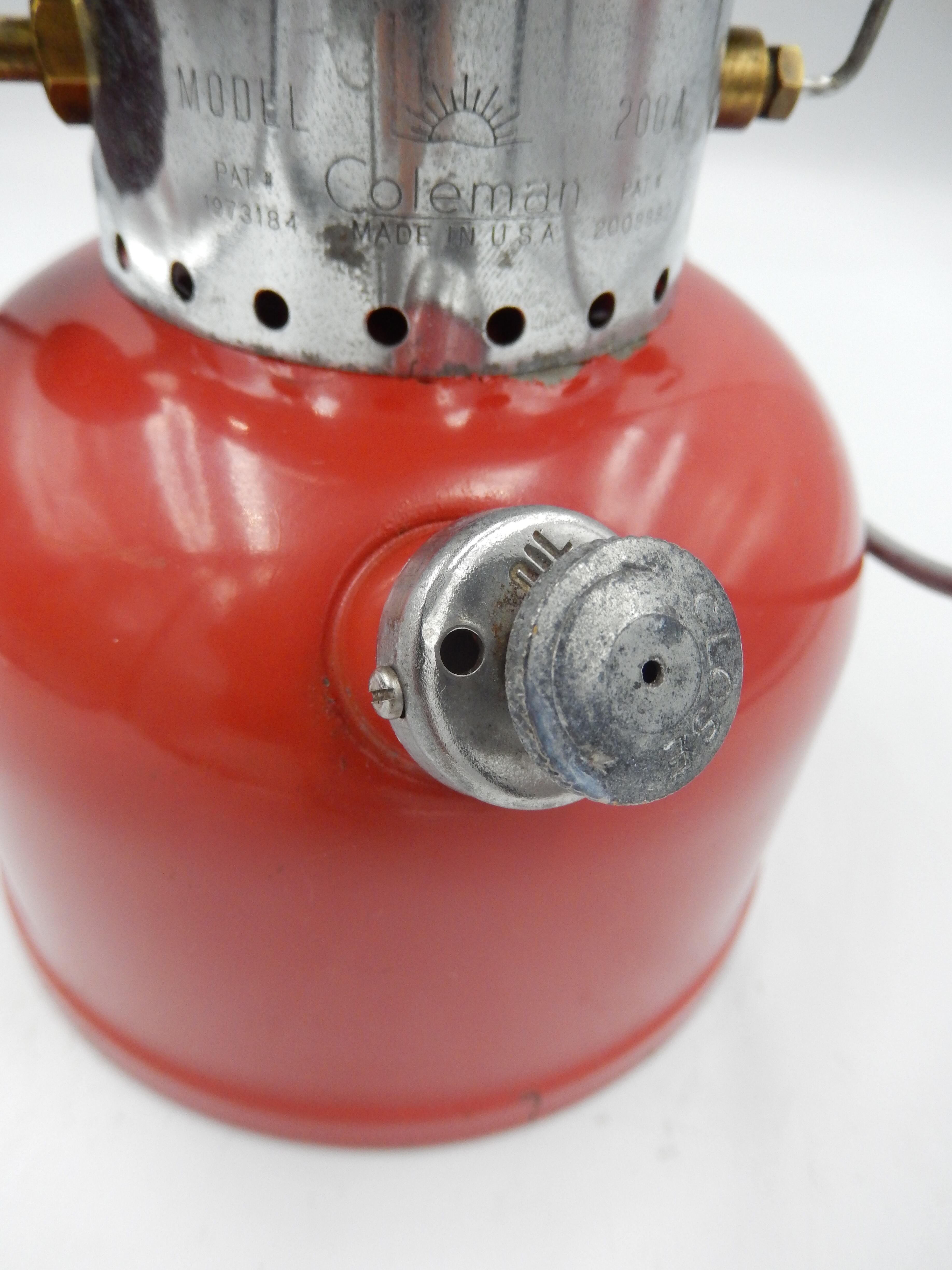 50年代特有の朱色のボディーカラーに、グリーンサンシャイングローブ、ブルーポイントの入った横穴の小さい50年代前半のオリジナルベンチレーター、写真では確認しづらいですがバーナーヘッドも、素焼き(陶器)のバーナーヘッド、燃料キャップもビス着き、ジェネレーターもシルバー色の銀ジェネレータがついています。