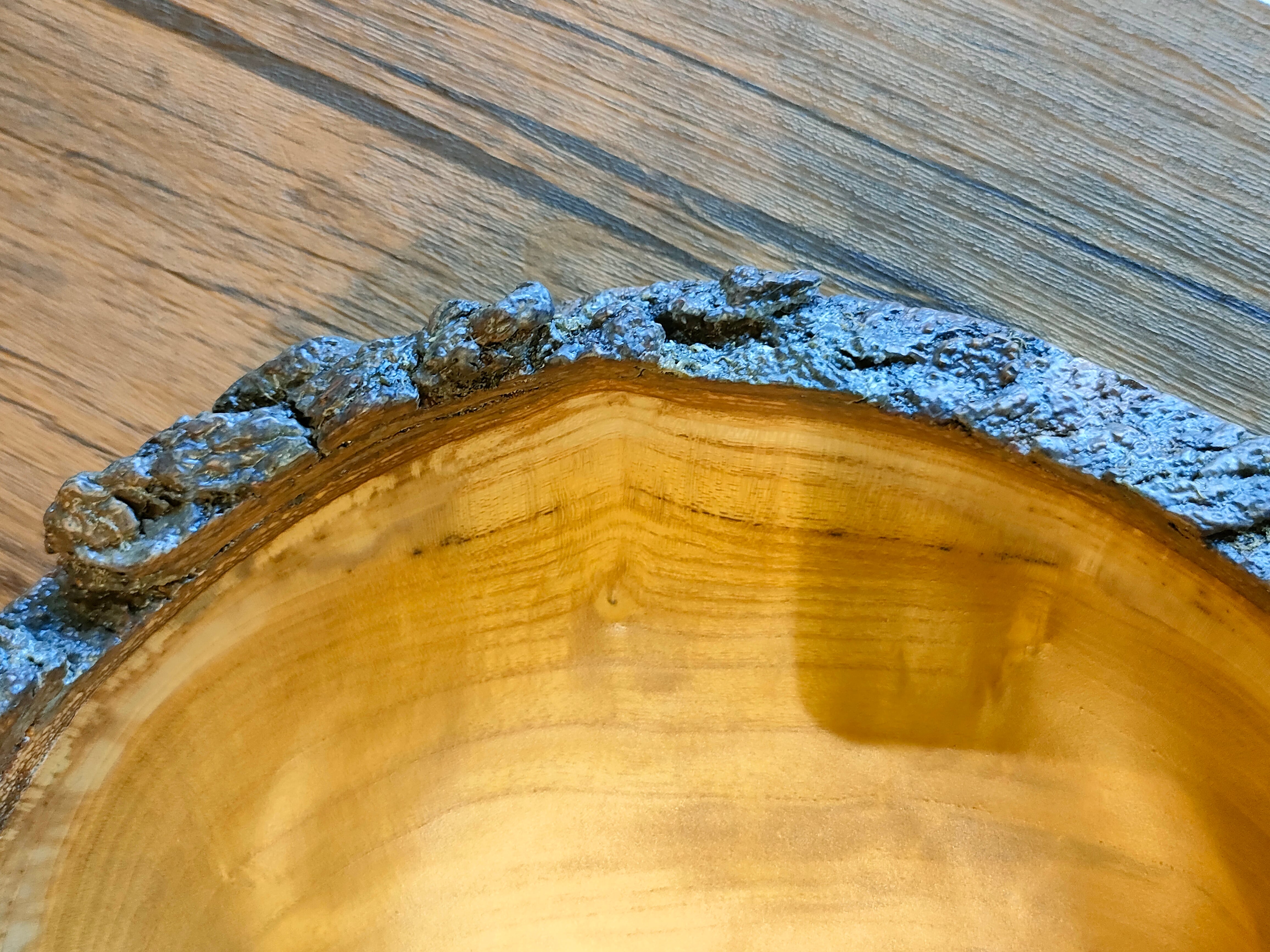 大ぶりの桑の木の珍しい黄色い部分だけをくり抜いて作った樹皮付きのボウル。